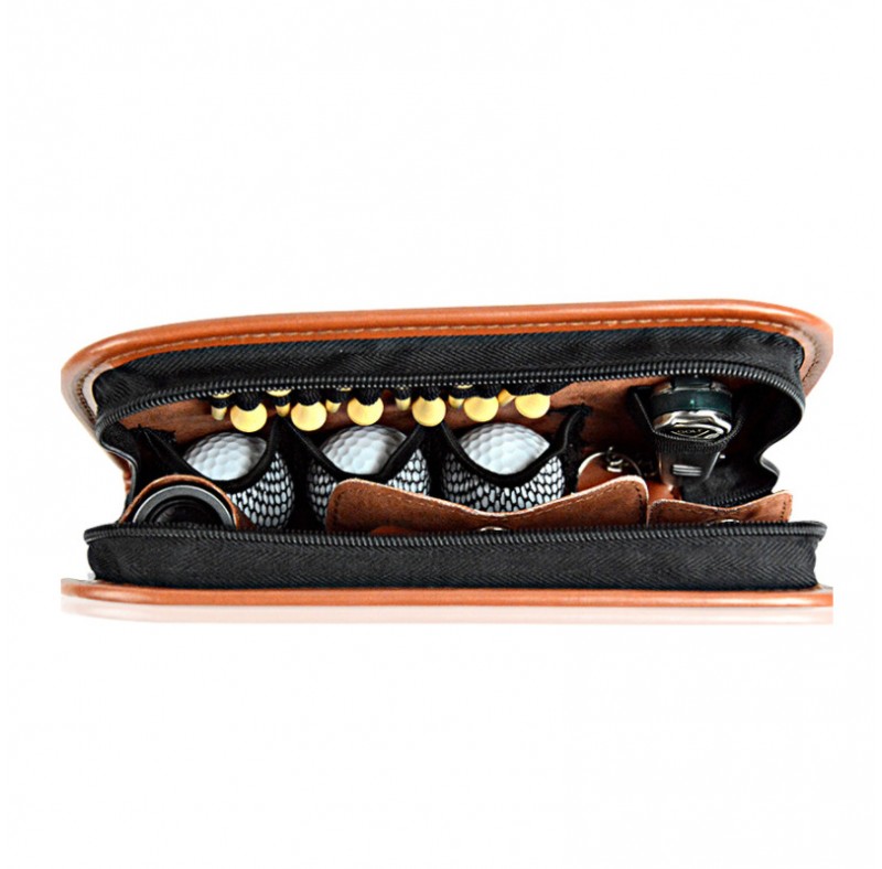 The golf bag is made of leather, includes golf tee, multi-function knife, golf ball, score card, rangefinder, ball clean brush and golf ball clip. It is easily to accommodate the full set of golf accessories, large capacity to allow you to enjoy more perfect space.